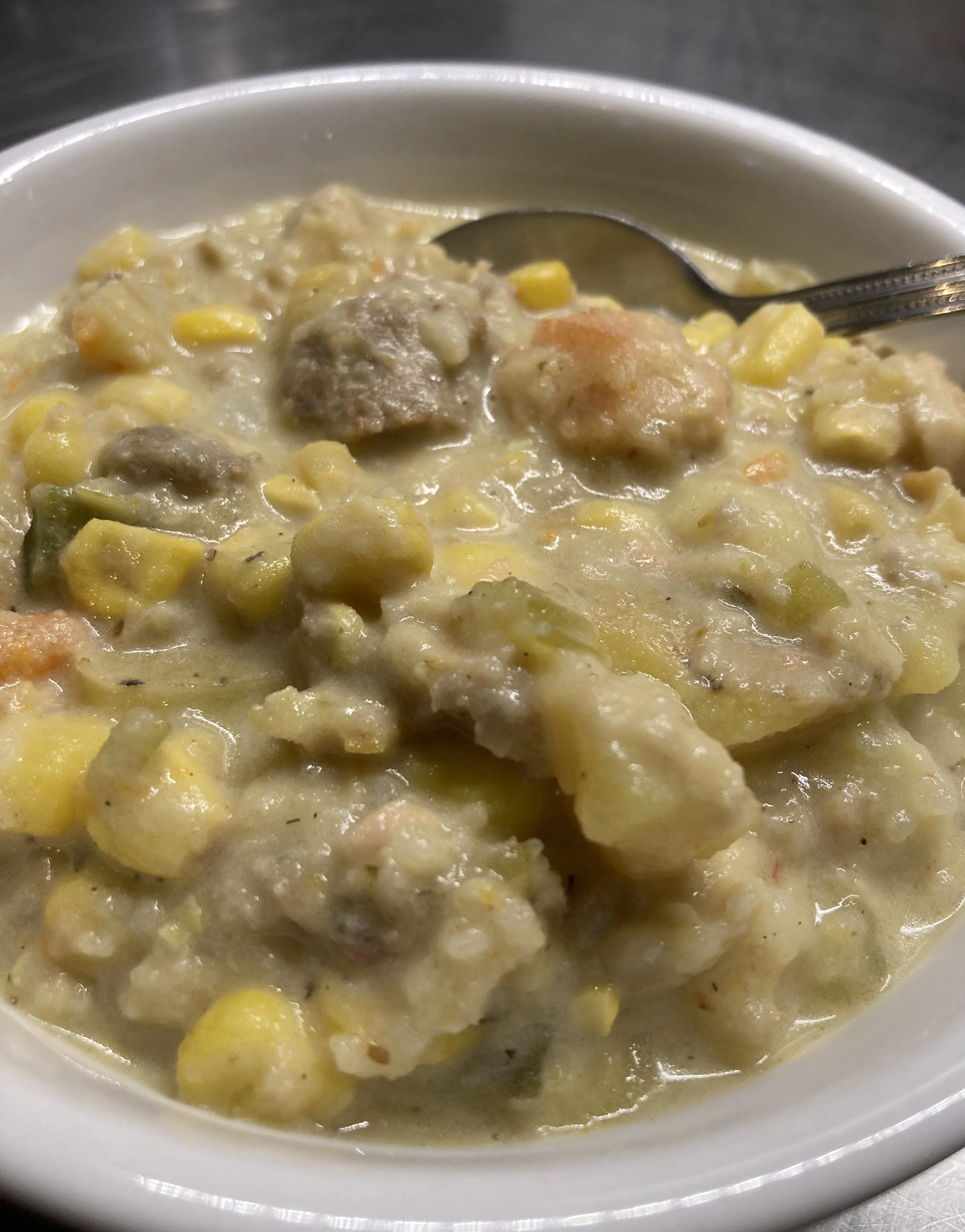 Clam chowder [chopped clams in juice, yukon potatoes, russet potatoes, onion, celery, carrot, cream, butter, garlic, herbs, spices, salt], corn chowder [sweet corn, pobano chilies, onion, celery, carrot, garlic, butter, cream, salt, black pepper, herbs, and spices], corn stock [water simmered with corn], smoked chicken stock [water simmered with smoked chicken parts, defatted and finished with onions, carrots, and parsnips], smoked salmon [wild line-caught AK pink salmon dry brined in salt, sugar, black peppercorn, juniper berry, and spices, smoked over apple wood], smoked pork sausage [pork shoulder ground with onion, apple, garlic, salt, herbs and spices, smoked over oak wood].