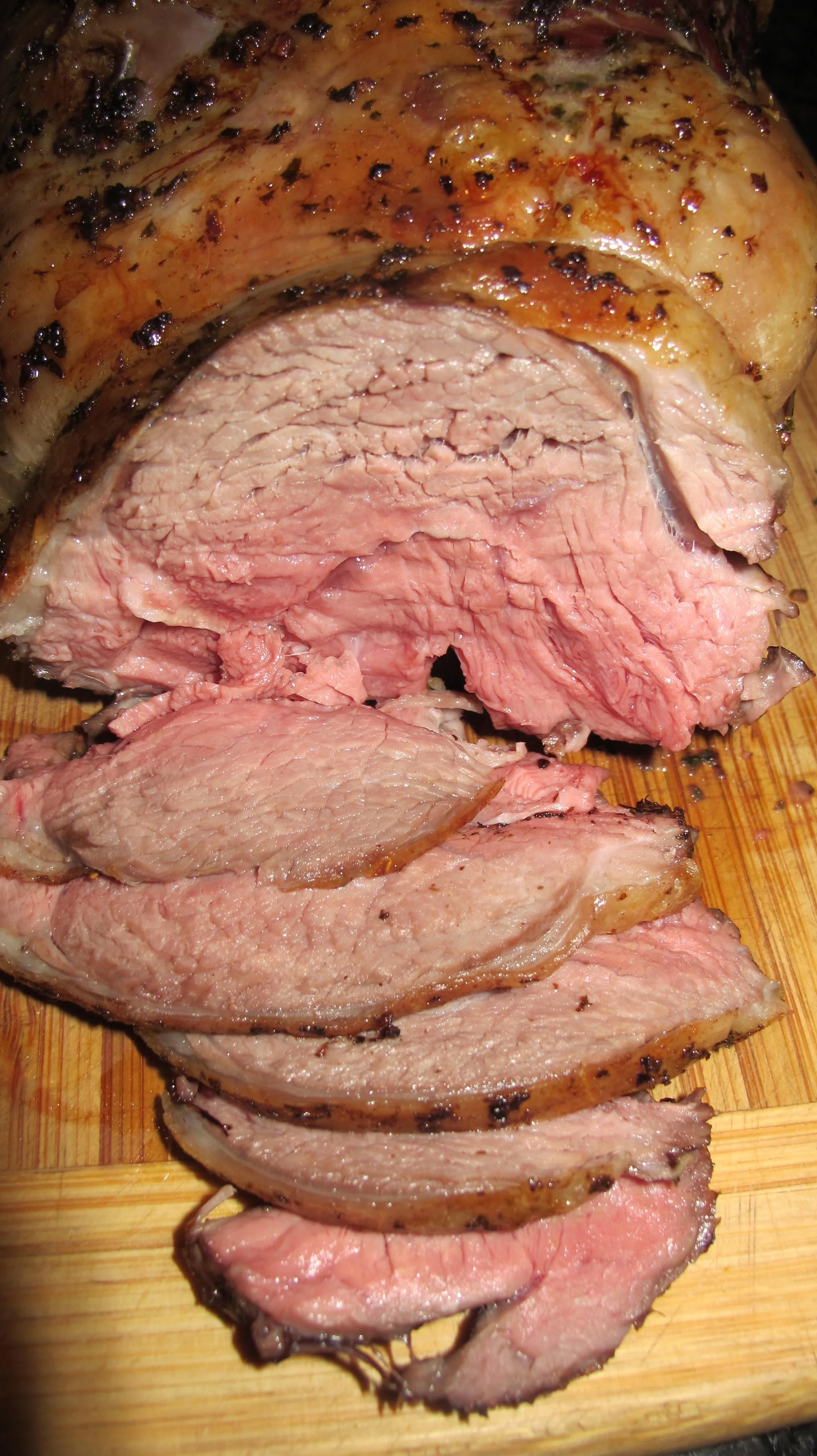 Slather the raw leg in pesto (or your preferred rub) and let sit, refrigerated, overnight. Next day, place on a roasting rack over a pan (line the pan with parchment for easy cleanup) and place in your home oven on as low a temp as you can get, around 250º. Check every hour or so with a digital probe thermometer, careful to probe away from the bone. Pull the leg out when it reaches 120º, and let it rest while you crank your oven up to its highest setting (or move to a hot grill). Sear the roast for about ten minutes, until the crust browns beautifully. Let it rest before carving.